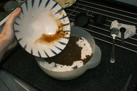 Verter la mezcla líquida (punto 3) dentro del agujero que hemos hecho en la mezcla seca (punto 2) y mezclar con una espátula. No hay que remezclar, solo combinar los ingredientes.