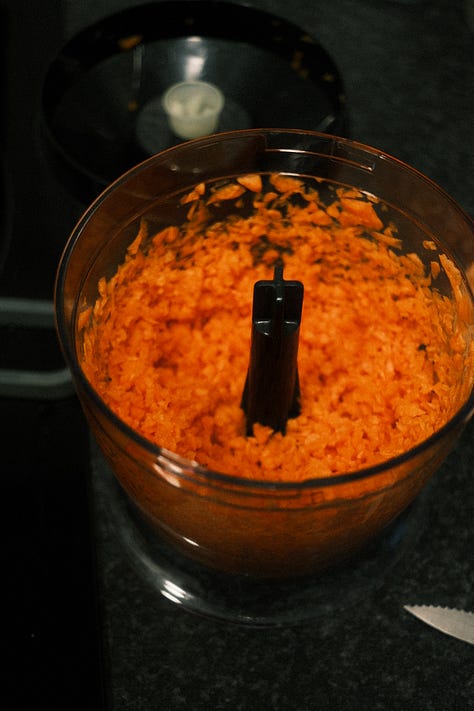 la zanahoria, cuanto más fina esté rallada, mejor, que así se deshace más en el bizcocho y le da mucho más dulzor.