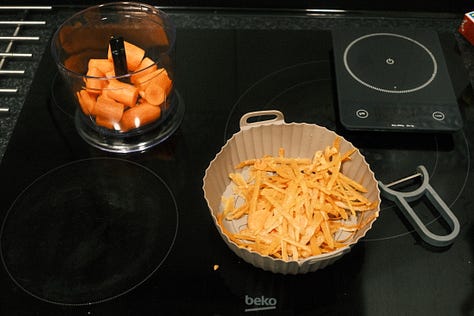 sé que está caro pero yo en su momento hacía esta receta con aceite de oliva, que me parece que es mucho más especial que usar otro aceite vegetal más soso. supongo que se podría usar aceite de coco, que le podría dar un toque, pero no sé si se quemaría o qué. yo lo dejo caer por si alguien se atreve a probar.