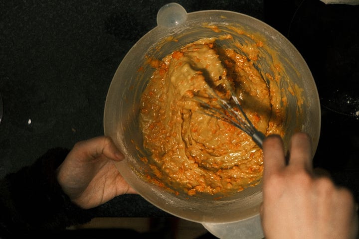 batir huevos, azúcar, levadura, aceite, harina y zanahoria rallada (en ese orden, se bate tras añadir cada ingrediente).
